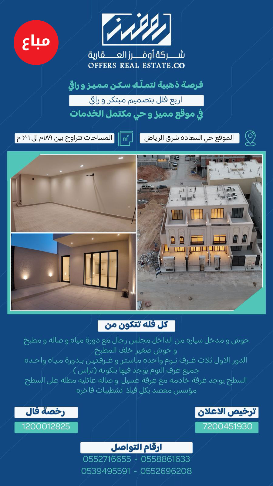 اربع فلل دبلكس متلاصقع بتصميم عصري ومختلف كل فيلا تلبي كافة احتياجات الاسره تتراوح المساحات من 189م حتى 201م